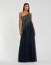 One-shoulder evening gown featuring allover sequins with a shimmering ombré effect and a flowing, elegant silhouette.